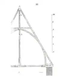 Il n'y a que dans la partie sur voûte de pierre que les entraits sont dans le même plan vertical que les poinçons supérieurs. Une seule ferme est complète avec poinçon d'un seul tenant.