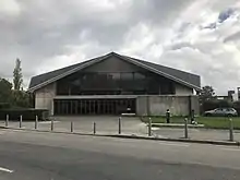 La façade est se développe sur deux niveaux, possède un accès au sous-sol et fait face au parc. Des vitres sont présentes au sous-sol mais le volume du rez-de-chaussée est entièrement opaque, constitué de panneaux triangulaire en béton préfabriqué[9].