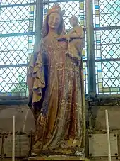 - La statue colossale de la Vierge à l'Enfant en pierre calcaire polychrome mesure 187 cm de hauteur, et date du premier quart du XIVe siècle. Elle provient donc de la précédente église. On la trouve au chevet du collatéral nord, qui est la chapelle de la Vierge. La mère est couronnée, et baisse son regard vers le spectateur. Par son bras droit, elle tient l'Enfant Jésus, qui tient une colombe dans sa main gauche, et affleure la poitrine sa mère par sa main droite. Selon le dossier de classement, « la silhouette de la Vierge, le traitement des drapés souples (drapés fluides qui épousent le haut de la silhouette et coulent ensuite en quelques plis souples et rectilignes qui s'écrasent sur les pieds), la ceinture placée très haut sous la poitrine, le visage de la Vierge et celui de l'Enfant autorisent à dater l'œuvre vers 1300-1315/20 ». Eugène Müller parle d'une « œuvre d'un grand air du XIVe siècle ». La sculpture est en mauvais état. Les doigts de la main droite de la Vierge manquent. La statue a été repeinte, partiellement dorée et agrémentée de cabochons au XIXe siècle, ce qui cache les éventuelles traces de la polychromie ancienne. Le visage de Marie et l'Enfant Jésus ont été décapés un peu brutalement, et souffrent d'épaufrures[12],[16].