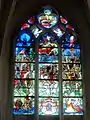 - Le vitrail dans le soufflet de la baie n° 3 ; les deux anges rouges dans les mouchettes, qui représentent des âmes ; et les deux personnages dans les losanges sont les seuls éléments anciens de cette verrière. La petite scène dans le soufflet représenterait l'Immaculée Conception, mais évoque plutôt l'Assomption. Les lancettes, postérieures à 1918, montrent, de gauche à droite, sainte Gabrielle, la Vierge à l'Enfant et sainte Laure[19].