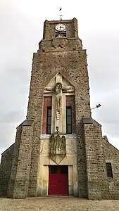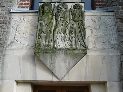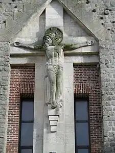 Le portail principal est orné de sculptures représentant, en bas-relief, trois saints (Marie-Madeleine, la Vierge et saint Jean) encadrés par deux anges agenouillés, réalisés par Albert Binquet qui est également le créateur du grand Christ du clocher, en 1928[2].