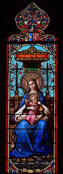 Au centre du chœur se trouve un vitrail représentant une reine blanche avec à ses pieds deux esclaves noirs enchaînés. Il a été réalisé par Joseph Villiet vers 1860[3].
