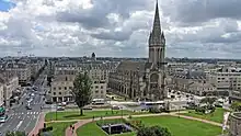 Dans la nuit du 8 au , la flèche de l'église, fauchée par un obus de 406 mm probablement tiré depuis le Rodney, s'effondre de ses soixante-douze mètres dans la nef. Un début d'incendie détruit également la toiture. Reconstruit en 1957, le clocher fait aujourd'hui soixante-quinze mètres, soit six de plus que les tours de Notre-Dame dont la petite flèche culmine à quatre-vingt-seize mètres.
