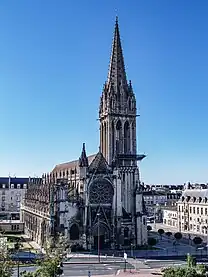 Les travaux s’échelonnent sur plusieurs siècles mais respectent l'unité d'ensemble qui offre encore aujourd’hui des parties remarquables. La tour est élevée en 1308, l'aile droite en 1410, l'aile gauche peu de temps après, le grand portail ou Portail Neuf en 1384. La façade nord est ornée au XIVe siècle d'une immense rosace d'une extrême légèreté. Au XIVe siècle, on construit également son célèbre clocher gothique, considéré comme « le roi des clochers de Normandie » et qui influencera de nombreux autres monuments. La flèche de la chapelle Notre-Dame du Kreisker à Saint-Pol-de-Léon par exemple s'en inspire fortement[4]. Les bas-côtés et les parties hautes de la nef sont construits au XVe siècle dans le style flamboyant. Menés par Hector Sohier, les travaux de l'abside, construite sur pilotis sur l’Odon, des voûtes du chœur et des ailes sont commencés en 1521 et terminés sans doute un demi-siècle plus tard. Contrastant harmonieusement avec le reste de l’édifice, c’est l'un des exemples les plus parfaits de la première Renaissance caennaise. Le porche sous la tour est restauré en 1608 avec des ornements en statues.