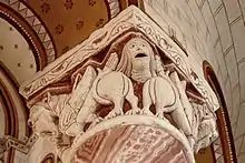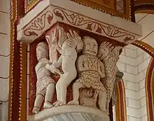 Selon Ingeborg Tetzlaff[2], le chapiteau montre une figure humaine fantastique avec deux corps qui grandissent ensemble dans une tête commune, aux côtés de divers monstres. Le thème serait le conflit de l'âme humaine.