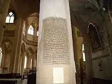 « Ci devant gît Messire Aubin Bouillon, prêtre, l'un des habitués de céans, lequel décéda le jour saint Michel l'an mil cinq cent cinquante deux. Priez Dieu pour lui. Pater Noster. Ave Maria ».