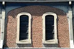 La façade comporte deux registres. Le registre inférieur est tripartite : sa partie centrale est composée d'un panneau de briques rouges surmonté d'un large arc en anse de panier en béton tandis que les deux parties latérales (correspondant aux collatéraux) sont sommées chacune d'un arc rampant.