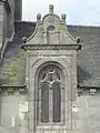 Le portail occidental, qui porte la date “1616”, est surmonté de trois clochetons à dôme. Au fronton, une niche abrite une statue de saint Pierre[3]. La baie Sud-Ouest est de la même époque et rappelle l’ornementation du château de Kerjean. Le clocher, élevé de 1582 à 1584 par Jean Le Taillander, auteur de celui de Ploubezre et de l’arc triomphal de Saint-Jean-du-Doigt[2]. Il est sommé d’une flèche octogonale qui culmine à 45 mètres de haut, entourée d’un balustre, de clochetons d’angle[3] et d'une tourelle d'escalier octogonale au coin sud-est[4].