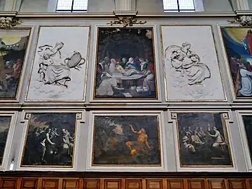 Au dessus des stalles se déroulent en deux niveaux quatre séries de représentations artistiques. Le premier niveau est partagé alternativement entre d'une part des scènes en noir et blanc de la vie de saint Bruno, fondateur de l'ordre des Chartreux, attribuées à François Fayet, et d'autre part des fresques représentant les grandes figures de l'érémitisme chrétien (saint Paul de Thèbes, saint Antoine du T, etc.). Au second niveau, les fresques représentant des scènes de la vie du Christ alternent avec des bas-reliefs en stuc qui présentent des allégories des vertus cardinales et monacales, réalisés par Pierre Lucas (père du sculpteur des anges du maître-autel). L'ajout de l'orgue et de sa tribune au XVIIIe siècle s'est fait au détriment de certains de ces panneaux aujourd'hui recouverts.