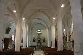 - Le premier niveau est une chapelle intégrée dans la nef halle, sa voûte en croisée d'ogives torique sans clef et ses ouvertures en plein cintre révèlent l'origine primitive du bâtiment.