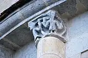 Toutes les sculptures[3] du chevet se trouvent sous la corniche : une vingtaine de modillons et quatre corbeilles sans tailloir.