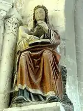 - La statue en pierre polychrome de la Vierge à l'Enfant assise, ou Vierge de majesté, mesure 143 cm de hauteur et date de la fin du XVe ou du premier quart du XVIe siècle. Elle a été considérée comme datant du XIVe siècle lors de son classement en 1905. En 1910, Victor Le Ronne en donne la description suivante lors d'une conférence à Magny-en-Vexin : « C'est une statue de pierre, recouverte de badigeon. Vierge-mère assise, tenant l'Enfant Jésus sur le genou droit. L'Enfant, nu jusqu'à la ceinture, a le reste du corps couvert d'une draperie. Sa main gauche se joint à la main droite que luit présente sa mère. La figure a été maladroitement restaurée. La Vierge est vêtue d'une tunique aux plis droits et sévères ; la tête est ceinte d'une couronne d'où s'échappent les boucles de ses cheveux ; sur ses genoux se trouve posé un livre ouvert. Les pieds sont chaussés de souliers à bouts arrondis, de forme simple et sans ornements. Ce n'est pas un chef-d'œuvre. Certaines parties sont traitées très sommairement ; la figure de l'Enfant-divin, notamment, est assez grossièrement taillée ; mais, malgré ces imperfections, elle mérite, je crois, d'attirer l'attention. D'après l'expression calme et béate des figures, la familiarité de l'attitude de l'Enfant, la draperie du bas de la robe, la forme ronde des souliers, je crois que cette statue doit dater du commencement du XVIe siècle »[20],[21].
