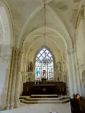 C'est à la fin de la période romane que l'on peut situer le voûtement de l'ancienne base du clocher, et la construction de la deuxième et de la troisième travée du chœur, qui se termine par un chevet plat. L'église se résume alors à un seul vaisseau : au sud, l'on aperçoit toujours les traces d'une ancienne baie en plein cintre, dont la moitié a disparu lors de l'ouverture du mur vers la chapelle latérale sud, au milieu du XIIIe siècle. Le diamètre de son arc paraît important pour une fenêtre, mais le soubassement comporte une arcature plaquée en plein cintre, qui retombe sur deux colonnettes à chapiteaux. L'une des corbeilles est sculptée de feuilles d'eau, l'autre est abîmée. Il ne pouvait donc pas y avoir d'arcade vers une chapelle. Le tracé en plein cintre indique la période romane. L'emploi de l'arc brisé pour les trois voûtes d'ogives ne constitue toutefois pas une contradiction, car son apparition en Île-de-France est attestée vers 1125, dans l'actuel département de l'Oise (considéré comme faisant partie de l'Île-de-France dans l'histoire de l'architecture)[10]. Les chapiteaux et les petites clés de voûte, travaillés au trépan, sont d'une grande qualité, et reflètent bien le style du milieu du XIIe siècle. Il convient de préciser que toutes les fenêtres du chœur (concentrées dans la dernière travée) sont bien postérieures à la construction, et que l'entablement à la limite des allèges a été ajouté à la Renaissance, sans doute en même temps que fut créée la large baie du chevet.