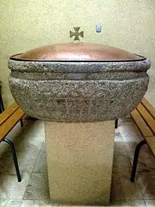Au fond, sous la tribune, ont été placés des fonts baptismaux du XVIe siècle[1] en granit. Ceux-ci sont de style byzantin, probablement conçus pour des baptêmes par immersion. Modifiés à l'époque contemporaine, ils comportent maintenant non plus une seule grande vasque, mais deux petits bassins.