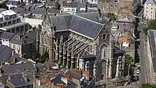 À la suite du siège de Nantes par les armées de Louis XI en 1487 durant la guerre folle, l'évêque Pierre du Chaffault fait réparer et agrandir la basilique : celle-ci prend la forme d'une croix latine, conserve son abside mérovingienne, mais la nef est prolongée vers l'ouest et est flanquée de deux croisillons. Le clocher à l'ouest, surélevé de 1,20 mètre par rapport au niveau de la rue, mesurait 32,43 m de haut et était composé d'une tour carrée d'une hauteur de 17,30 m et d'une superficie de 30 m2, soutenue par des contreforts et ornée d'étroites fenêtres en anse de panier pour éclairer l'escalier ; d'un beffroi de bois en forme d'aiguille de 3,50 m de haut ; d'un pavillon d'une hauteur de 6,05 m ; et d'une flèche d'ardoises de 3,48 m de haut surmontée d'une boule et une croix d'une hauteur de 2 mètres[1].