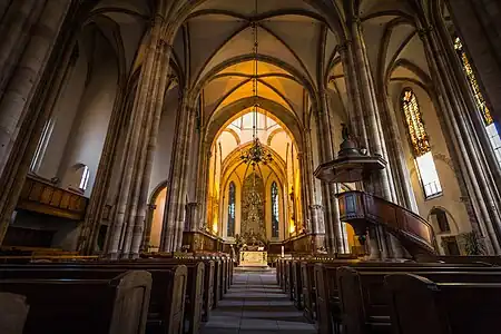 À l'intérieur, sa longueur est d'environ soixante-cinq mètres, sa hauteur d'environ vingt-deux mètres - environ trente mètres sous la coupole de la croisée du transept, de style gothique tardif -, sa largeur d'environ trente mètres. Les deux côtés des nefs latérales extérieures abritent des tribunes. À droite et à gauche de l'abside du chœur se trouvent des chapelles séparées, également de style gothique tardif. L'église est classée monument historique depuis 1862.