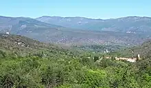 La situation de "Tour de Corts" (à gauche), avec, à droite en bas, le village de Taurinya, et, au-delà, l'abbaye Saint-Michel de Cuxa.