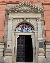 La façade comporte deux tours de 50 mètres de haut avec des flèches coniques. Il y a trois entrées avec des portails en grès. Ils sont décorés de trois reliefs en majolique italienne aux couleurs vives, réalisés à Florence à partir de modèles de Ludvík Šimek[5] : dans le tympan de l'entrée principale, il s'agit d'un relief de lunette avec une demi-figure de Saint-Pierre. Venceslas parmi les anges, au-dessus des entrées latérales reliefs circulaires (appelés tondo) d'Agnès de la Česká et Groznaty d'Ovence. La fenêtre ronde au-dessus du portail est ornée d'un vitrail avec une demi-figure de la Vierge Marie et de Jésus-Christ, visible uniquement de l'intérieur.