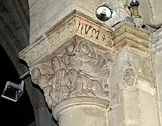 - Chapiteau 5 La corbeille est sculptée sur les trois faces. Chaque dé est supporté par la tête allongée d'un homme. Aux angles pendent deux reliefs ovoïdes, peut-être des pignes.