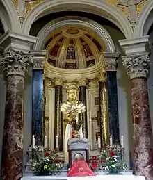 L'hypothèse[12] que des éléments en maçonnerie de l'ancienne église ont été conservés dans le nouvel ensemble (les bâtiments plus la nouvelle église) est fondée. L'emplacement de l'ancienne abside coïnciderait avec l'actuelle chapelle de la Sainte Vierge. Des considérations à l'appui de cette hypothèse concernent la forme de la nouvelle église. La persistance de la structure maçonnée de l'abside, avec ses proportions, en aurait affecté le plan et le développement en élévation. La rotation de 90 ° de l'axe de l'église (nécessaire pour l'obtention d'un bâtiment plus petit dans le même lot), aurait exigé la construction d'une chapelle symétrique et grande d'autant.