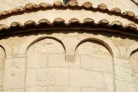 L'abside, couverte de tuiles, est percée d'une fenêtre à simple ébrasement et présente une décoration de bandes lombardes composées de lésènes et d'arcatures.