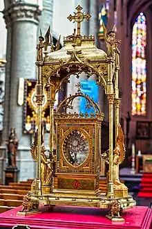 L'église Sainte-Catherine abrite le reliquaire du Saint-Sang de Boxtel. Contrairement au Saint-Sang de Bruges, ce n'est pas une relique du sang du Christ, mais la vénération d'un miracle qui se concentre sur la vénération de l'Eucharistie. L'histoire parle d'un prêtre, Eligius Van den Aker, qui avoue sur son lit de mort qu'il a renversé du vin sacramentel blanc sur la nappe de l'autel après la consécration, donc après que le vin devienne le «sang du Christ». La tache sur la nappe de l'autel est immédiatement devenue rouge. Ces nappes d'autel font rapidement partie de la dévotion populaire de Boxtel. Après la paix de Münster, les catholiques des Pays-Bas, le protestantisme représentait une église plus sobre où les textes bibliques occupent une place centrale. Les draps sont transportés à Anvers pour y être mis en sécurité. Le 20 mai 1652, les draps arrivent à l'église Sainte-Catherine de Hoogstraten, en Belgique. Une demande est faite au pape pour organiser une procession avec les draps. Depuis lors, la procession sort par beau temps, emportant le sanctuaire. Après la Seconde Guerre mondiale, le cortège est renouvelé par le doyen Jozef Lauwerys et le prêtre Remi Lens. Il est sorti pour la première fois en 1952. Il se divise en quatre parties : les groupes d'ouverture, la représentation de l'Eucharistie, de Notre-Dame et des sacrements. La procession se clôture par l'ensemble du conseil municipal, portant une lanterne de procession[19],[20].