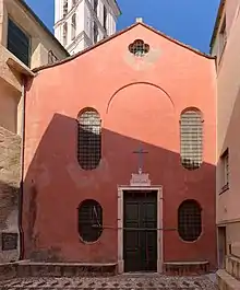 La façade principale se trouve côté sud. Elle est sobre et dépouillée. On trouve trois inscriptions au-dessus de la porte. La plus haute est un hommage et une marque de rattachement de la confrérie à l'église Saint-Jean-du-Latran.