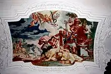 La quatrième et dernière fresque du plafond, dans la travée occidentale, illustre les souffrances de trois chartreux exécutés à Londres en 1535. La partie droite du tableau montre un autel païen garni de guirlandes. Un chien brun assiste à la scène. Un officier à cheval, revêtu d’une cuirasse dorée, regarde un soldat devant lui qui s’apprête à jeter un cœur ensanglanté dans le feu allumé sur l’autel. Au sol, le cadavre d’un chartreux dénudé jusqu’à la taille, qui porte une plaie béante au milieu de la poitrine. Sa tête est légèrement entourée d’une auréole. À gauche de ce corps, un autre chartreux nu est placé sous un treuil, dans le genre de celui équipant un puits, d’où une corde garnie d’un crochet est introduite par un autre mercenaire dans le ventre du supplicié, qui gît les bras allongés au-dessus de la tête. Un homme à barbe blanche actionne la manivelle, un autre soldat porte un faisceau de licteur. La moitié gauche du tableau est occupée par un paysage, dans lequel un cavalier tire et traine au sol un chartreux attaché par les mains. Une falaise, un paysage montagneux et une ville fortifiée illustrent le fond, tandis qu’à droite, sur une tribune au-dessus des tortionnaires, quelques personnes observent la scène. Sortant d’un nuage, un ange, accompagné de putti, prépare déjà les palmes et couronnes du martyre.