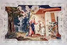 La fresque nord illustre la Visitation de la Vierge Marie. Marie, coiffée d’un chapeau, figure au centre. Elle est représentée en position surélevée, à l’entrée d’un bâtiment à colonnes, vêtue d’une robe rose et d’un manteau bleu. Sa main droite se tient à la barrière, tandis que la gauche s’étend en direction de l’épaule d’Elisabeth. Cette dernière femme âgée à longs cheveux gris, porte un habit vert et manteau rose. Son bras droit s’étend vers l’avant, et elle touche du doigt le ventre déjà arrondi de Marie. Entre les deux femmes, un petit chien jappe en direction de la Vierge. Derrière celle-ci se tient l’époux d’Elisabeth, Zacharie, vieil homme à barbe blanche, en conversation avec Joseph de Nazareth, l’époux de Marie. Le haut de l’image est occupé par une architecture baroque, avec colonnes et pampres de vignes.