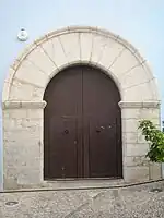 La façade est simple, dénudée, et seul se détache le portail en plein cintre où les voussoirs sont entourés par une imposte et par une moulure circulaire.