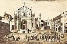 Les Carmes déchaux venus de Lublin avaient fait construire une petite église de bois pour leur couvent en 1627. quelques années plus tard, ils en font construire une plus grande en pierre grâce aux dons du vice-chancelier du grand-duché de Lituanie (rattaché à la Pologne par l'Union de Lublin), Michel-Christophe Pac[1]. Consacrée au milieu du XVIIe siècle à la grande mystique carmélite sainte Thérèse d'Avila, l'église est de type basilical, avec une façade ressemblant aux églises jésuites de l'époque. Elle est probablement construite par l'architecte Ulrich Gosius qui fut l'auteur du palais Radziwill de la ville. La façade, quant à elle, fut certainement dessinée par l'architecte italien Constantino Tencalo qui dessina la chapelle Saint-Casimir abritant les reliques de saint Casimir de Pologne dans la cathédrale de Vilnius.