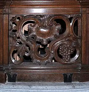 Les lambris en chêne du chœur sont ornés de figures d'anges qui s'en détachent. Ces lambris se prolongent sur les ces colonnes qui encadrent l'entrée du chœur, et qui portent une statue en bois polychrome de sainte Barbe, à gauche, et de saint Éloi, à droite.