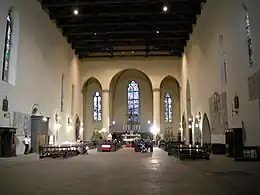 Le portail est remarquable ainsi que l'immense espace intérieur avec plafond à fermes de charpente avec de hauts piliers polygonaux soutenant les voûtes d'arêtes de l'abside[1].