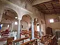 A l'intérieur, l'église a un plan basilical avec trois petites nefs, séparées les unes des autres par six colonnes (trois de chaque côté), provenant d'édifices romains. Les murs sont en pierre et en briques apparentes et le toit est en treillis.