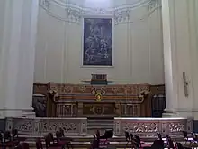Le maître-autel de bois est décoré de stucs avec des panneaux de faux marbre.