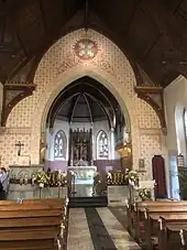 La charpente apparente formant voûte (hammerbeam roof), typiquement anglaise, confère une grande part de son originalité à cet édifice. Dans le prolongement de la nef latérale, la chapelle de la Vierge (Lady Chapel), conçue comme un bras du transept (symétrique à la chambre de l'orgue situé de l'autre côté du chœur), conserve le décor peint en 1914-1915 selon le projet d'un architecte nommé Cleverly, peut-être Charles Frederic Moore Cleverly, admis en 1883 comme candidat associé au Royal Institute of British Architects[8]. Une imposante grille en fer forgé, plus baroque que gothique, ferme la chapelle. De provenance anglaise, elle est due à la firme Sex & Sons[9].