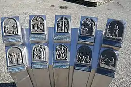- un carillon automatique de 23 cloches, dont les trois plus grosses mobiles, peuvent sonner à la volée[5],[6]. Chacune des 23 cloches (fondues par la fonderie Paccard d'Annecy en Haute-Savoie[7]) a un nom et est décorée de bas-reliefs (reproduits au sol) des épisodes des évangiles de la Bible, réalisés par le sculpteur Claude Dekumbis de Massongex[8] et par les moniales du Monastère de Bethléem des Voirons en Haute-Savoie. La cloche du jubilé a été bénite par le pape Jean-Paul II en 2000 à la Basilique Saint-Pierre de Rome.