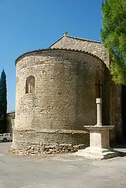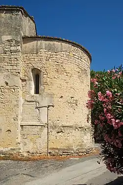 L'église possède un chevet semi-circulaire érigé sur un soubassement réalisé partiellement en moellon et partiellement en pierre de taille. Le chevet, séparé du soubassement par un cordon et une moulure, est réalisé en pierre de taille sauf la partie haute de la maçonnerie, réalisée en moellon, signe d'une modification du couronnement. Des blocs de pierre rose de Montpezat sont incorporés par endroits dans la maçonnerie.