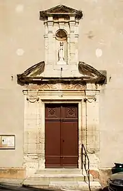 Le portail est composé de deux pilastres sommés de chapiteaux ioniques supportant un entablement comportant une architrave moulurée et une frise ornée d'un cartouche et de rinceaux. Cet entablement supporte un fronton brisé encadrant une niche cintrée surmontée d'une coquille Saint-Jacques et encadrée de pilastres supportant un fronton triangulaire. La clé d'arc qui surmonte la niche porte le millésime de 1668.