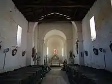 Un arc, dont le sommet est coupé par la charpente, sépare la nef d'une travée plus haute, couverte d'un plafond cintré en bois.