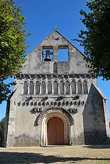 La façade est percée d'un portail unique, qui a conservé une archivolte romane, ornée de petites feuilles frappées de fleurons, un motif souvent utilisé en Saintonge.