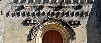 Ensuite, on voit une entaille dans la façade avec quatre corbeaux, qui suggèrent l'existence autrefois d'un ballet, sort d'auvent charpenté qui protégeait la porte romane. Les derniers éléments sculptés de la façade sont une longue arcature aveugle de onze cintres, qui se développe sous une forte corniche à damiers portée par seize modillons figurés.