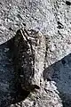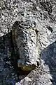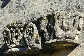 - Un homme nu en traîne de manger une hostie (l'eucharistie sacrilège). Habituellement dans cette représentation l'homme est aussi ithyphallique, ici, le modillon a été martelé entre ses jambes.