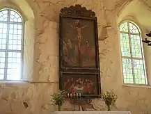 Les ouvertures fenêtres à l'extrémité ouest de la nef sont d'origine. La nef voûtée en berceau a un plancher peint[2].
