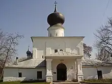 Cet édifice marquait à l'origine l'endroit de passage de la rivière sur un bac. Le cours de la Velikaïa est lent mais les eaux sont abondantes. Sa silhouette bien dégagée est fort découpée. Le clocher-arcade est détaché de l'ensemble et tourne sa façade vers le krom de Pskov. L'ensemble des bâtiments ressemble de loin à un petit village[2].
