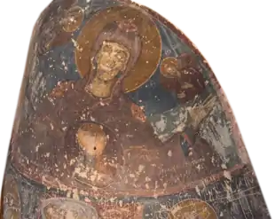 À l'intérieur, les fresques d'origine sont partiellement conservées ; elles se composent d'une zone avec des personnages en pied et de représentations des Grandes fêtes liturgiques augmentées de scènes dépeignant la vie de la Mère de Dieu[2],[3]. L'iconostase, massive, est construite en maçonnerie ; ce type d'iconostases ne subsiste que dans l'église Saint-Georges de Staro Nagoritchané et dans l'église blanche de Karan, même si elle s'est perpétuée dans l'église Saint-Dimitri de Janačko Polje et dans l'église Saint-Nicolas de Chopsko Roudaré[5]. La maçonnerie de l'iconostase est peinte elle aussi, avec des représentations de la Mère de Dieu et du Christ sur un trône, en tant que juge et sauveur[4].