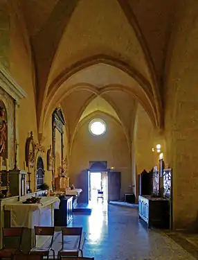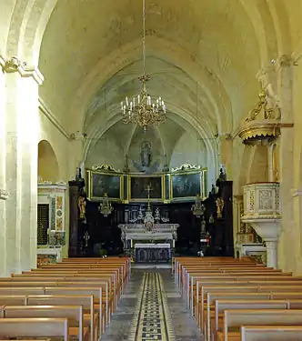 La nef, romane, comprend trois travées et sa voûte en berceau légèrement brisé est soutenue par des doubleaux à ressaut appuyés sur des piliers massifs. Le chevet, gothique, est constitué d'une travée de chœur voûtée sur croisée d'ogives et d'une abside à cinq pans, toutes deux aussi hautes et larges que la nef.