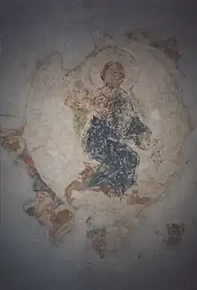 La zone située au-dessus de l'autel, dans une demi-coupole (en conque) et une voûte du bêma, est intéressante malgré le médiocre état de conservation de la peinture. Dans la demi-coupole est représentée la Vierge avec son fils tenu de la main gauche, siégeant sur un trône.