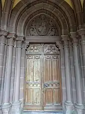 Sur le décor en bas-relief en grès rose, les noms des membres de la famille Straus-Durckheim sont gravés :