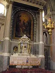 Les peintures de l'église, de style baroque, sont attribuées à l'atelier de Paul Troger (1698-1762), qui fut professeur à l'Académie des Beaux-Arts de Vienne. On peut y voir des représentations des Apôtres Paul et Pierre, réalisées dans une technique rare de mosaïque en gypse. La crypte de l'église abrite les tombeaux de la famille Marcibanji, réalisés entre 1812 et 1870, notamment par un sculpteur inconnu venu de Vienne ou de Budapest[1].